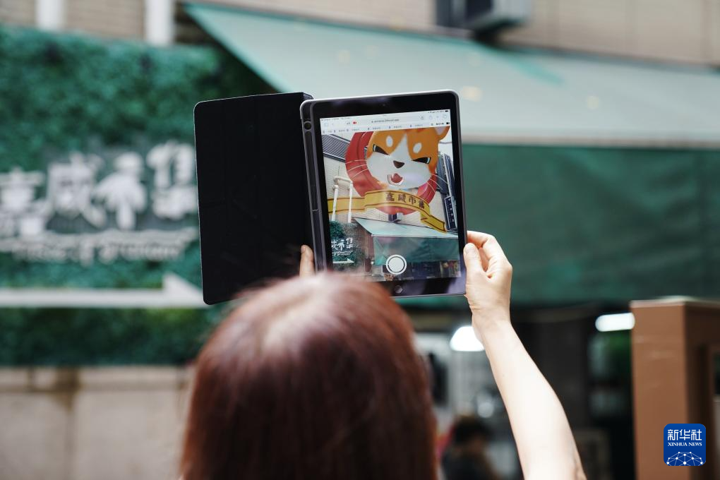 导赏员林嘉君在中环AR公共艺术“打卡”景点旁用平板电脑扫描二维码,慵懒的“小嘉猫”跃然出现(11月21日摄)。新华社发(王申摄)