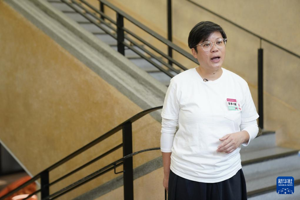 导赏员严静仪在香港中环街市接受采访(11月21日摄)。新华社发(王申摄)