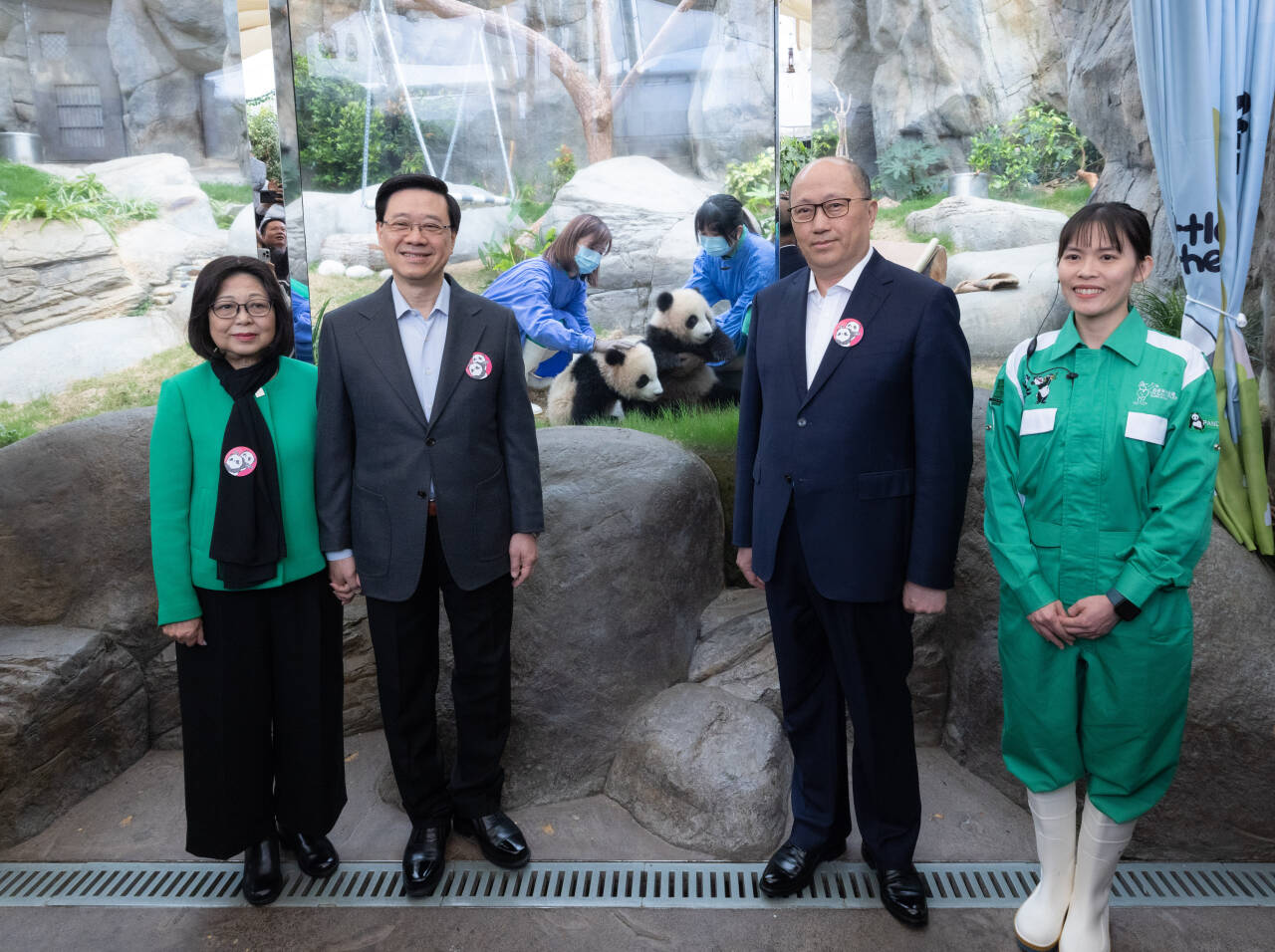 与大熊猫龙凤胎合影。(图片来源:中央政府驻港联络办)