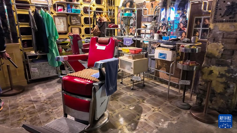 《九龙城寨之围城》电影展览内的复古风格理发店(2024年12月16日摄)。新华社发(龙镜伊 摄)