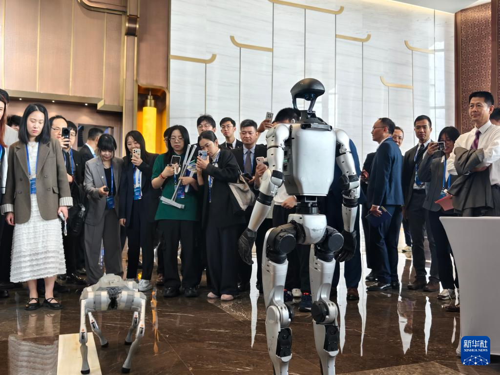 4月19日,在“创新融合·共筑未来”港澳青年浙江行活动中,港澳青年代表与宇树科技机器人、机器狗互动。新华社记者 刘梓漪 摄
