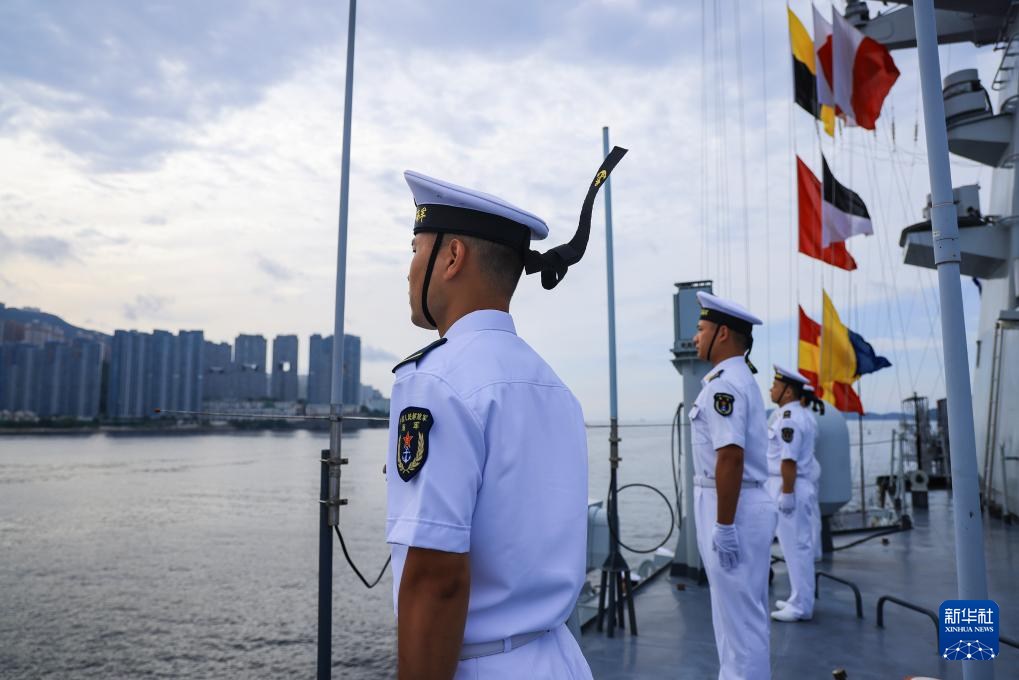 10时,湛江舰放下舷梯,海军和编队有关领导及官兵代表踏上昂船洲军营码头,与前来欢迎的香港各界人士亲切握手、互致问候。欢迎仪式开始,雄壮的国歌奏响。香港特区行政长官李家超致辞,代表香港特区政府和香港市民,对海军舰艇编队的到来表示热烈欢迎。中央港澳办、中央驻港机构、南部战区、驻香港部队相关负责人和代表出席仪式,并登上湛江舰、运城舰参观。