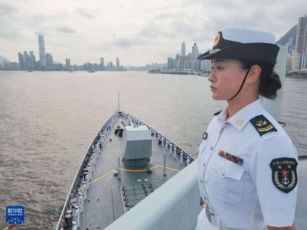 7月3日,中国海军山东舰航母编队抵达香港。这是分区列队的湛江舰官兵。新华社发(冯丽 摄)