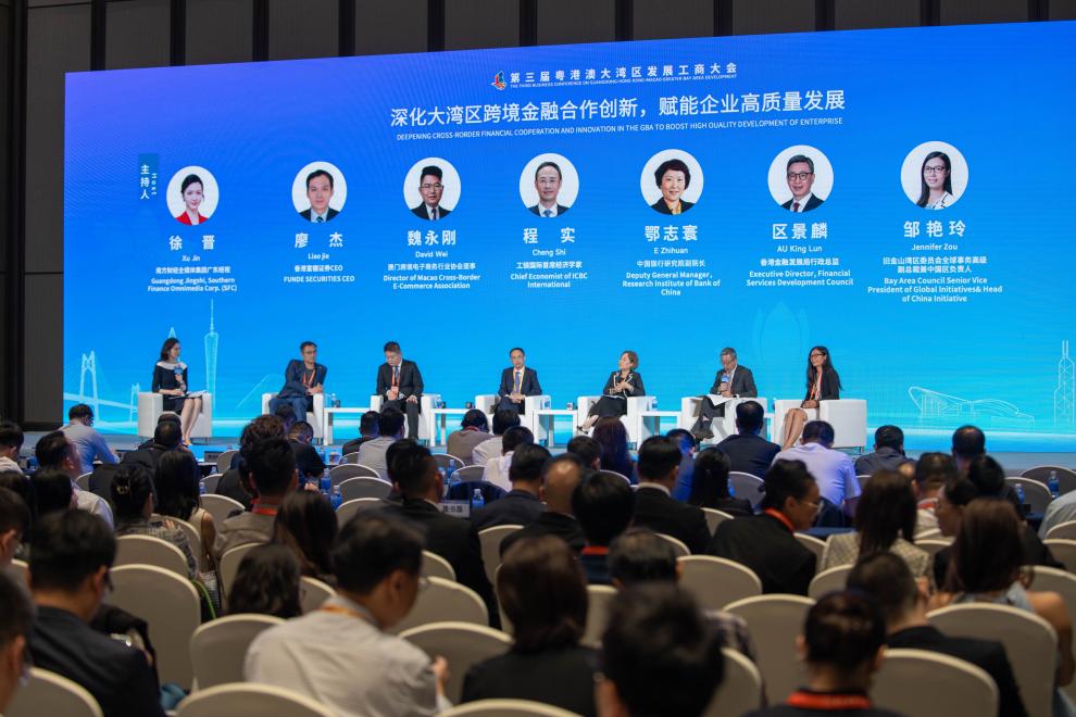 这是9月15日拍摄的第三届粤港澳大湾区发展工商大会“平行专题研讨一:粤港澳大湾区跨境金融合作”的现场。新华社记者 肖恩楠 摄