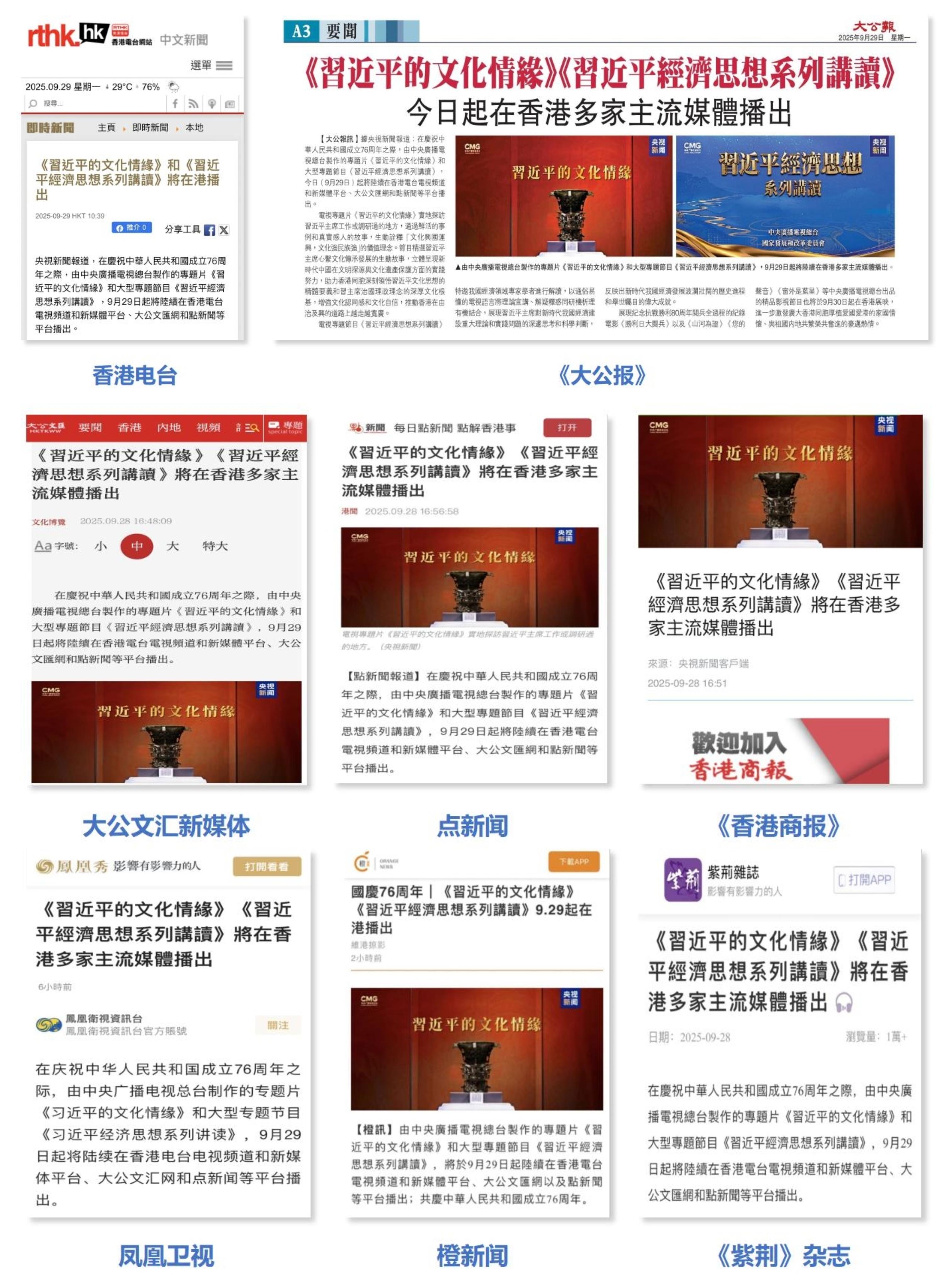 9月29日起,电视专题片《习近平的文化情缘》将在香港电台电视频道和新媒体平台、大公文汇网和点新闻等平台上线播出。大型专题节目《习近平经济思想系列讲读》也将于10月17日起在香港电台电视频道和新媒体平台播出。