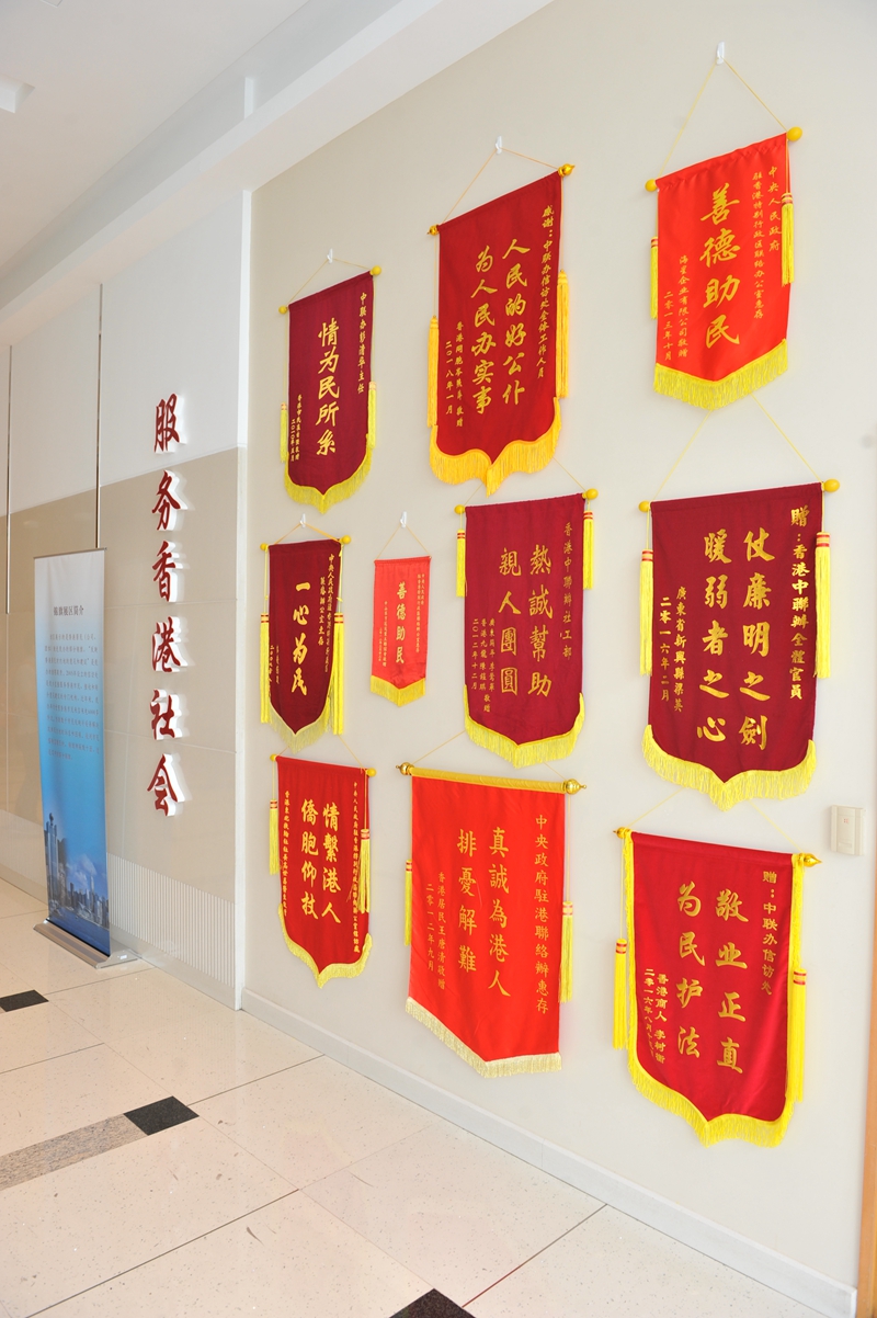 该区展示的是香港居民(公司、团体)致送我办的部分锦旗?!胺从诚愀劬用穸阅诘氐囊饧徒ㄒ椤笔俏野斓闹匾霸?,2005年设立的信访处是我办直接服务香港市民、接收和转介意见建议的专门机构。近年来,我办年均受理香港市民来信来电6000多件次,协助数千市民反映并妥善解决其涉及内地的诉求和困难,收到市民感谢信数百封,锦旗牌匾数十面。这是其中的部分锦旗。