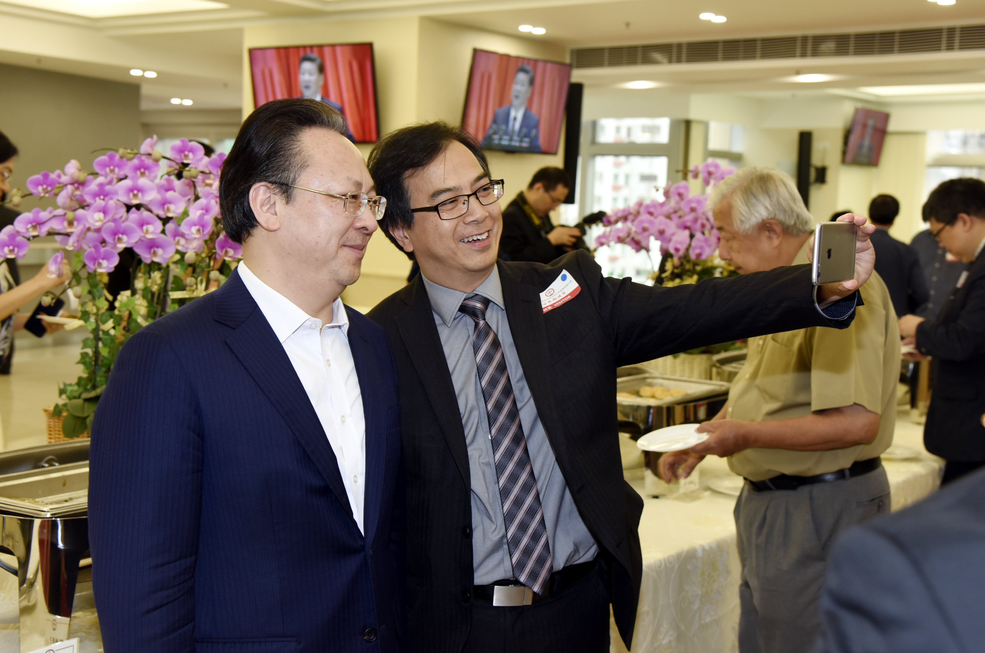 ?来宾在8楼员工餐厅与谭铁牛副主任自拍留影。(图片来源:中央政府驻港联络办)?