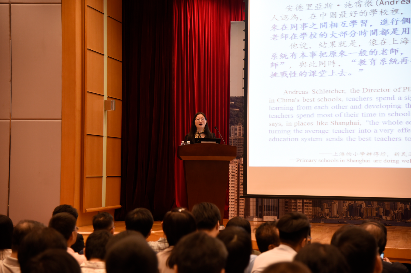 上海市教委教研室副主任王月芬作关于上海教育改革的专题报告。(图片来源:中央政府驻港联络办)