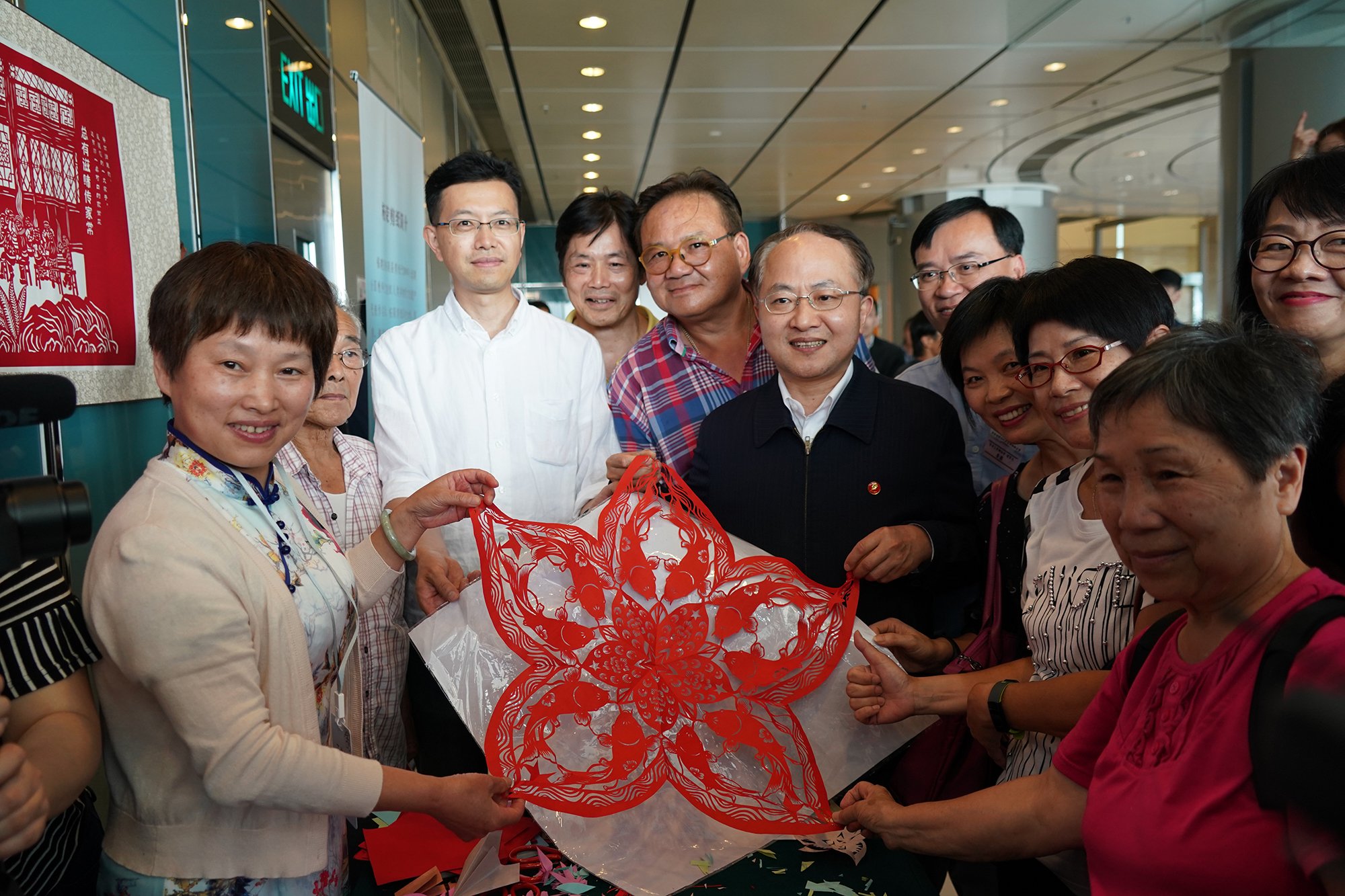 王志民主任参观剪纸艺术展台。(图片来源:中央政府驻港联络办)