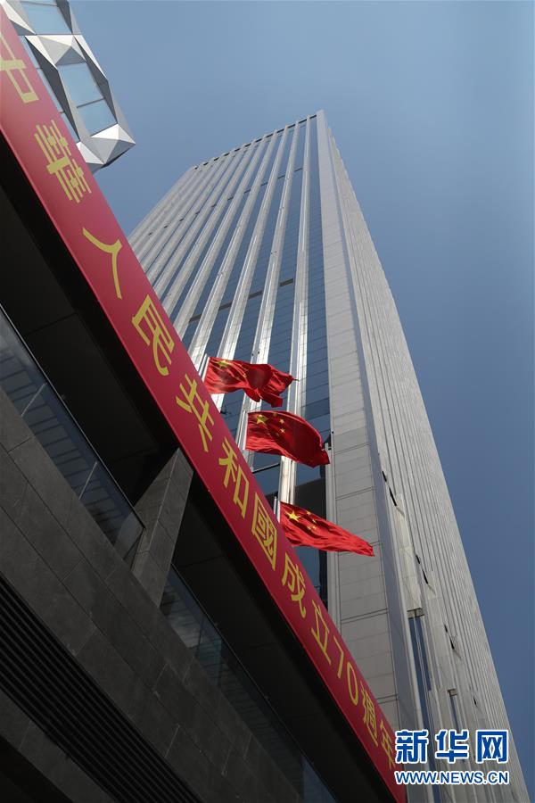 这是9月24日在香港告士打道上拍摄的国庆标语。国庆节将至,香港街头悬挂国旗,张贴国庆标语,庆祝中华人民共和国成立70周年。(新华社 卢烨 摄)