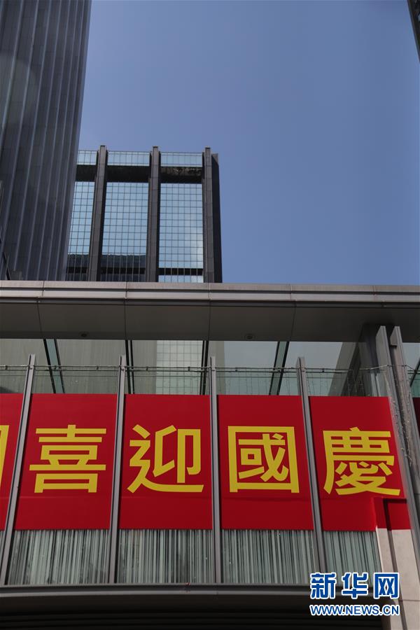 这是9月24日在香港告士打道上拍摄的国庆标语。国庆节将至,香港街头悬挂国旗,张贴国庆标语,庆祝中华人民共和国成立70周年。(新华社 卢烨 摄)