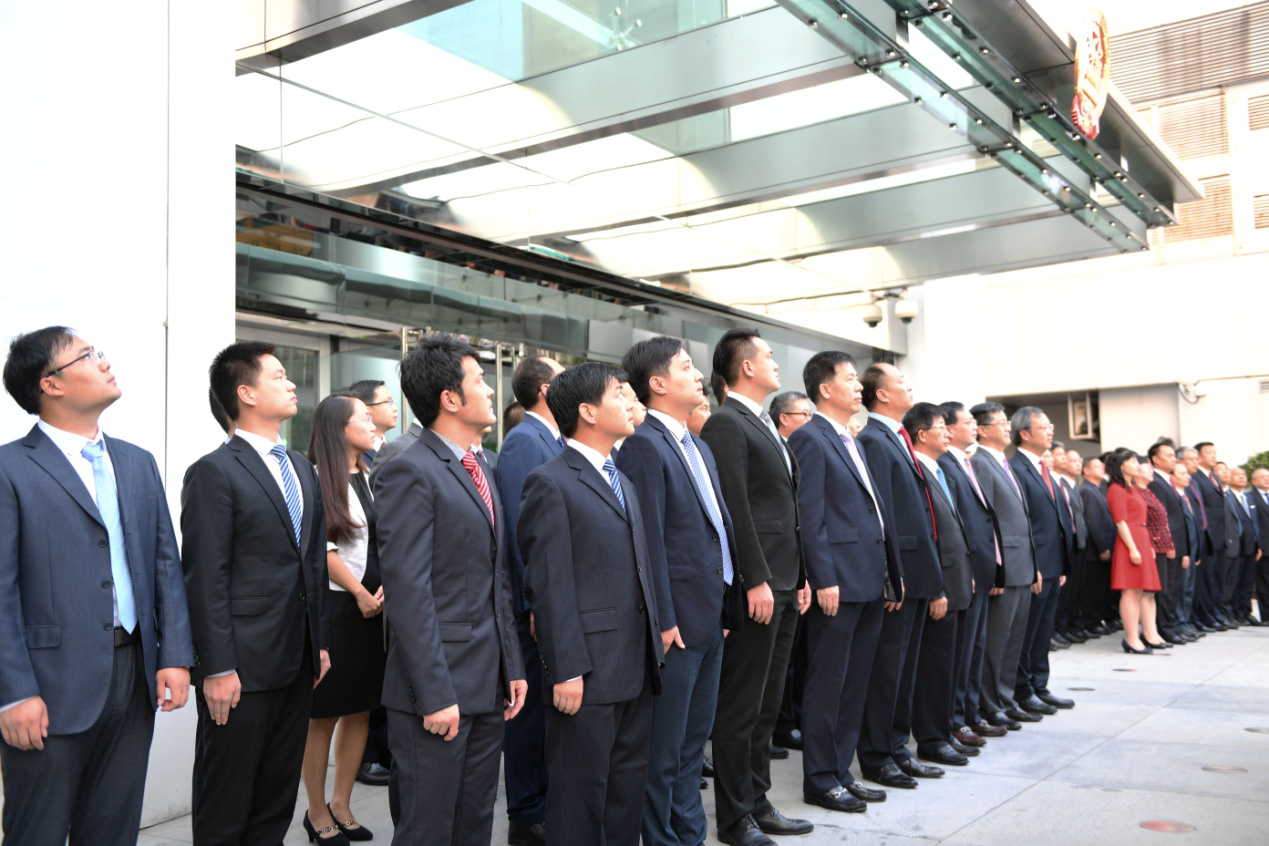 上午7时,升国旗仪式开始。激昂雄壮的义勇军进行曲响起,升旗手迈着铿锵有力的步伐护送国旗进场,在场的全体人员庄严地向国旗行注目礼,高唱国歌,鲜艳的五星红旗徐徐升起,在晨风中高高飘扬。香港中联办员工以这种庄严神圣的方式表达对伟大祖国的崇敬和热爱之情,为伟大祖国送上深情祝福,共同祝愿伟大祖国繁荣昌盛!