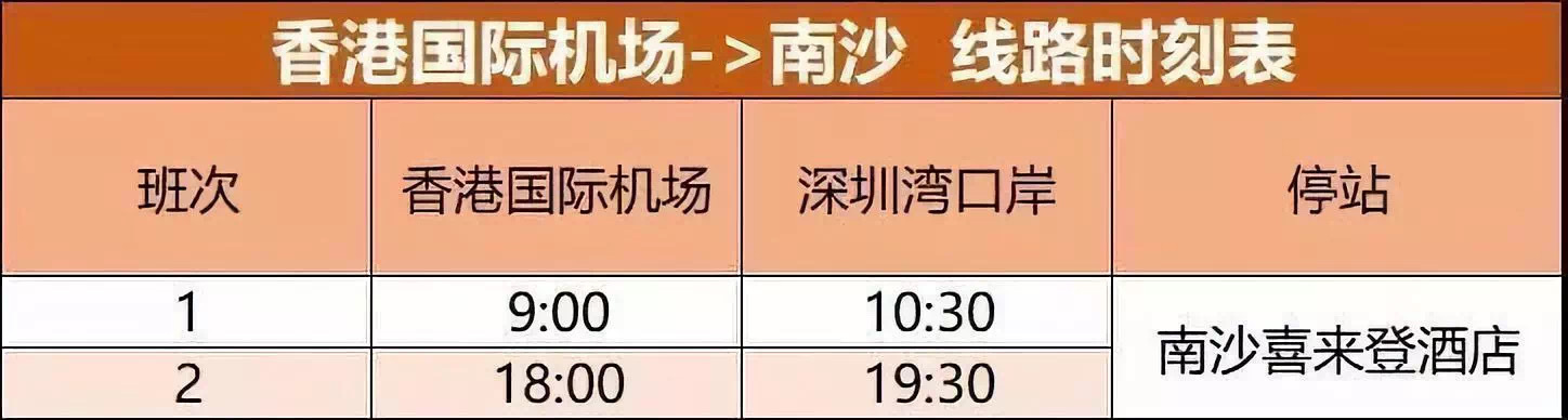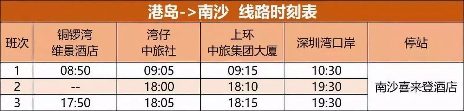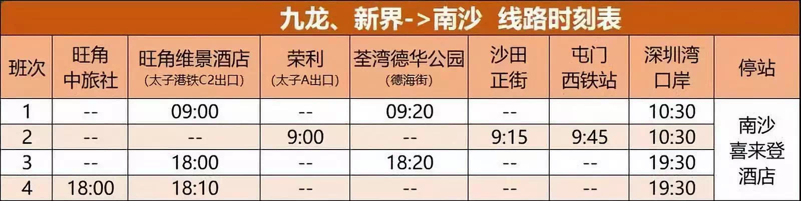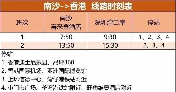 目前,南沙至香港发车时间为每日早晨7:50和下午13:50,沿途可??肯愀鄣鲜磕崂衷啊浩?60、香港国际机场、亚洲国际博览馆、上环信德中心、湾仔港铁站、屯门市广场、荃湾港铁站、旺角维景酒店等地。香港居民亦可在上述站点乘坐巴士。