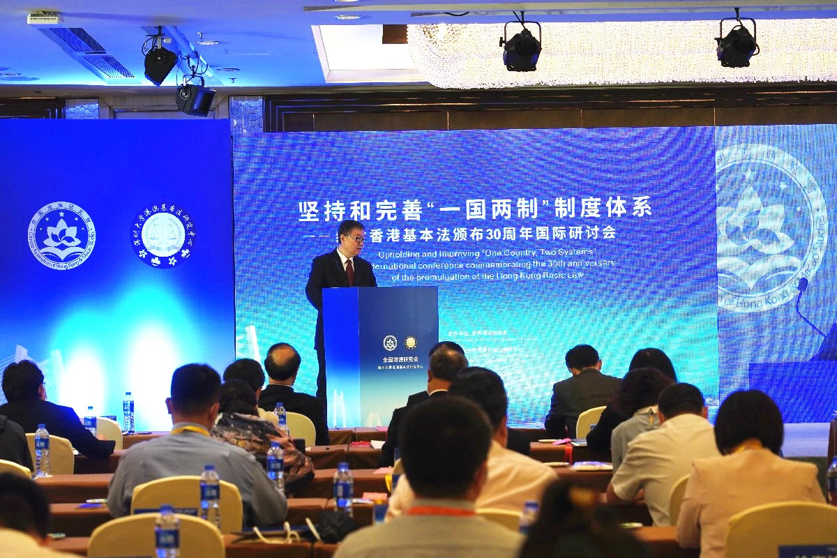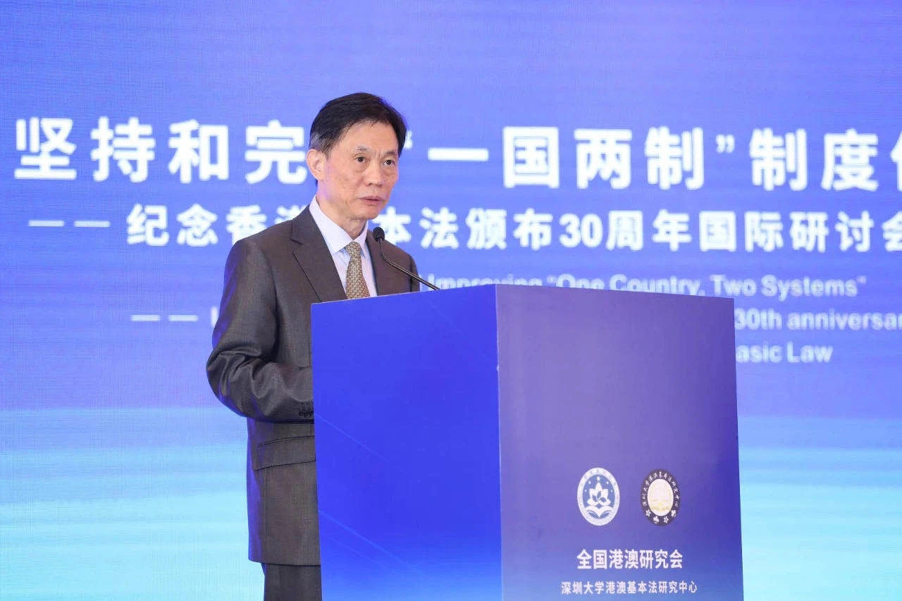 全国港澳研究会6月15日在深圳举办“坚持和完善‘一国两制’制度体系——纪念香港基本法颁布30周年”国际研讨会。中央有关部门负责同志和内地、香港、澳门以及来自俄罗斯、英国、德国、西班牙、印度近200位专家学者参加。因疫情原因,香港、澳门和外国专家学者通过视频连线的形式进行研讨。