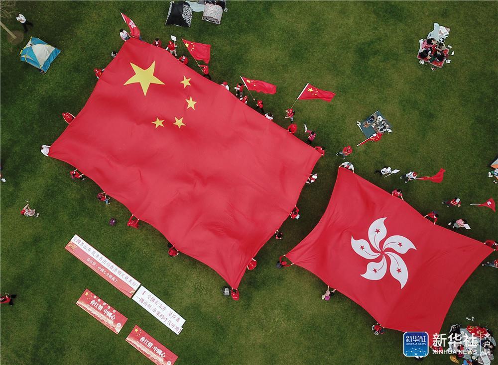 6日下午,香港特区政府总部附近添马公园内,数十名市民一起拉开、展示一面五星红旗和一面特区区旗。另外数十名市民同时拉开几条巨大横幅,上面写着“爱国者治港,乱港者出局,香港明天更美好”“‘爱国者治港’是推进‘一国两制’事业的时代呼唤”等大字?;褂卸嗝忻窕游枋种泻炱旌汀耙婪ㄍ晟葡愀垩【僦贫取薄按迪焓贝沤?,共筑美好家园”等标语。在场市民齐声高唱《歌唱祖国》,歌声激昂。