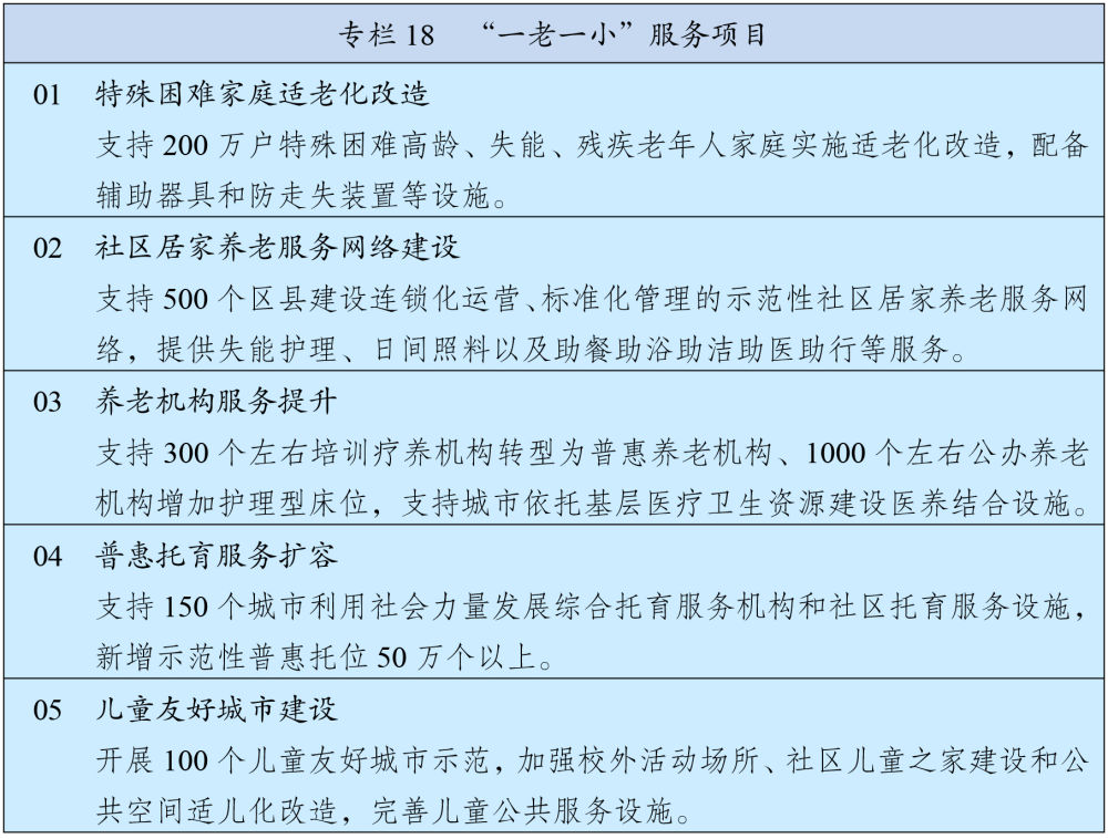 制定人口长期发展战略,优化生育政策,以“一老一小”为重点完善人口服务体系,促进人口长期均衡发展。