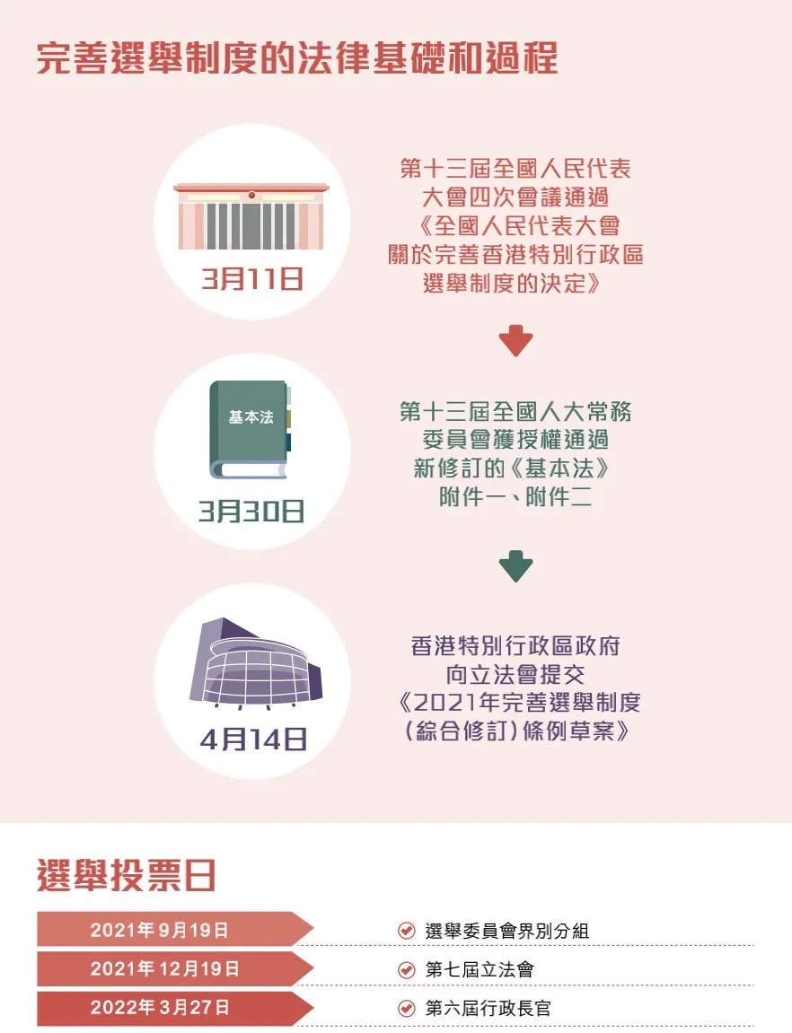 特区政府4月13日公布的草案显示,今年9月19日举行选举委员会界别分组选举,12月19日举行立法会选举,明年3月27日举行行政长官选举。