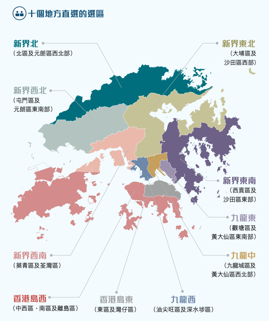 林郑月娥在记者会上公布,立法会直选将由10个选区组成,每个选区产生2席,其中新界分为东南、东北、西南、西北和北区5区、九龙将分东、中和西3区、香港岛和离岛合共2区,香港岛东包括湾仔区和东区,香港岛西包括中西区、南区和离岛区。
