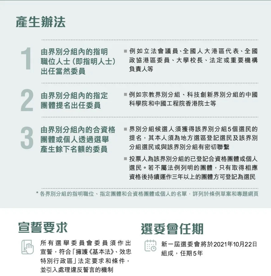 新一届选委会将于今年10月22日组成,任期5年,所有选举委员会委员须作出宣誓,符合“拥护《基本法》、效忠香港特别行政区”的法定要求和条件,并引入处理违反誓言的机制。