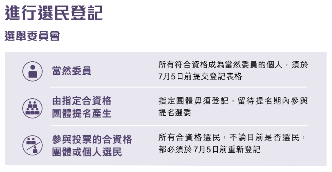 根据草案内容,一般地方选区选民如欲今年参加立法会投票,必须于5月2日前登记,功能界别当中因界别和选民基础增减而受影响的选民,可于7月5日前重新登记。