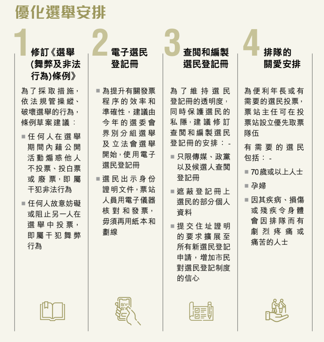有关选举安排方面,除了将煽惑他人不投票、投白票或废票列为干犯非法行为外,草案建议由今年的选委会界别分组选举及立法会选举开始,使用电子选民登记册,选民出示身份证明文件,票站人员用电子仪器核对和发票,毋须再用纸本和划线。