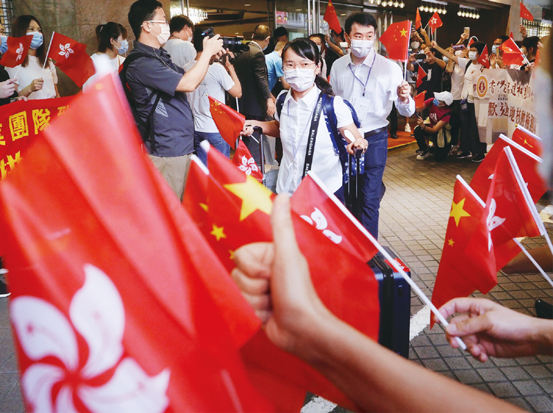 2020年9月16日,圆满完成协助香港特区抗疫任务的内地核酸检测支援队队员们离开香港,香港市民夹道欢送。(新华社记者 王申/摄)
