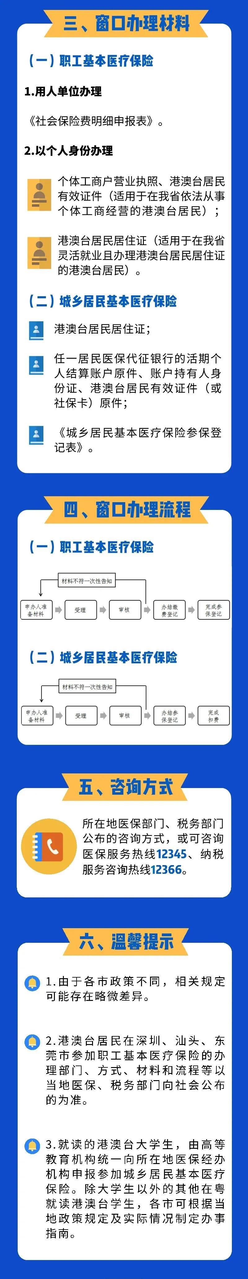 广东省医疗保障局联合广东省税务局日前印发《香港澳门台湾居民参加基本医疗保险参保缴费办事指南》(以下简称《办事指南》),以便更好促进在广东省学习、就业、生活的港澳台居民参加基本医疗保险。