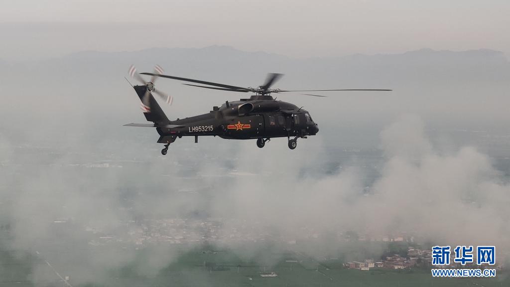 7月24日,陆军第83集团军某旅出动直-20直升机向河南省新乡市辉县洪州乡、峪河镇等地投送物资(手机拍摄)。新华社发(朱文海 摄)