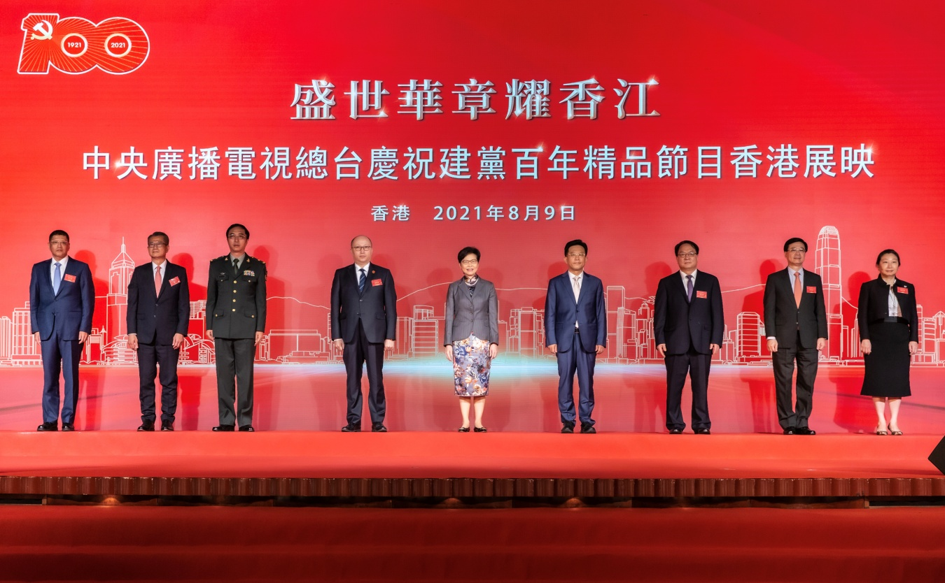 本网讯 8月9日,由香港特区政府、香港中联办、中央广播电视总台联合主办的“盛世华章耀香江——中央广播电视总台庆祝建党百年精品节目香港展映活动”在香港启动。香港特区行政长官林郑月娥、香港中联办秘书长王松苗、驻港国安公署署长郑雁雄、外交部驻港公署副特派员潘云东、解放军驻港部队副司令员郑国跃等在现场共同启动展映活动。中宣部副部长、中央广播电视总台台长兼总编辑慎海雄发表视频致辞。
