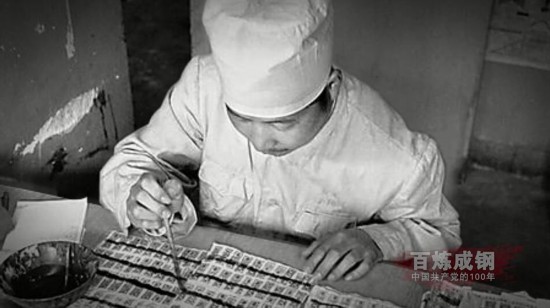 北京朝阳区西石门粮店的店员正在用毛笔认真地划去一排一排的粮票。