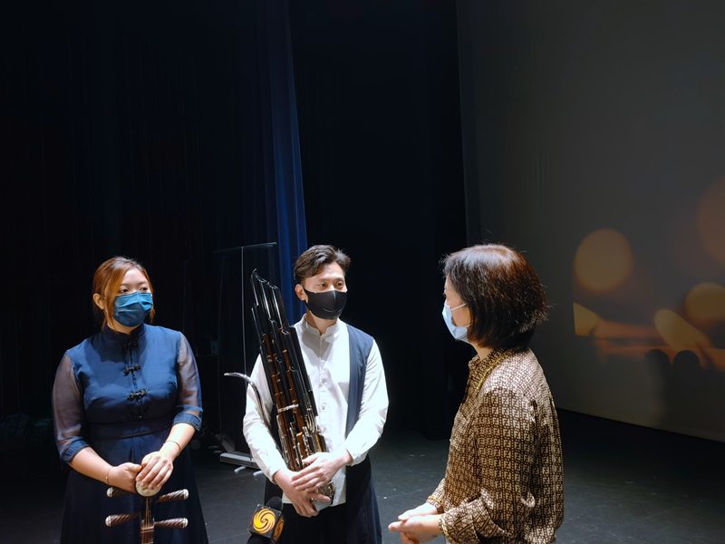 卢新宁副主任与天籁敦煌乐团成员交流。(图片来源:中央政府驻港联络办)