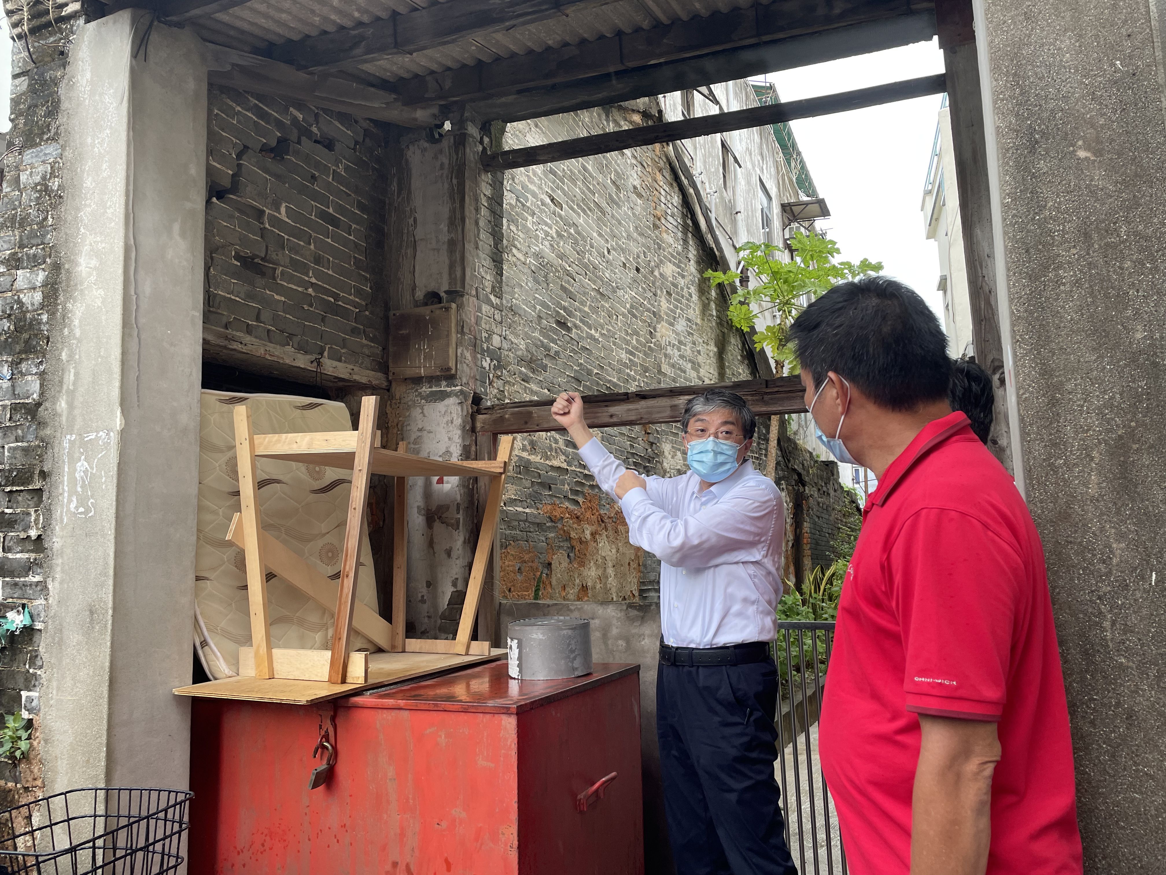 在大澳老街走访时,突降暴雨,随处可见的积水和堆放在路旁的废弃建筑材料,引起了罗永纲对几处房体倾斜、墙壁开裂旧房子的关注。村民们说,这些房子常年无人居住、年久失修,很有可能倒塌。他一再叮嘱,这太不安全了,要尽快拉上警戒线,挂上警示牌,采取防护措施,以免伤及行人。