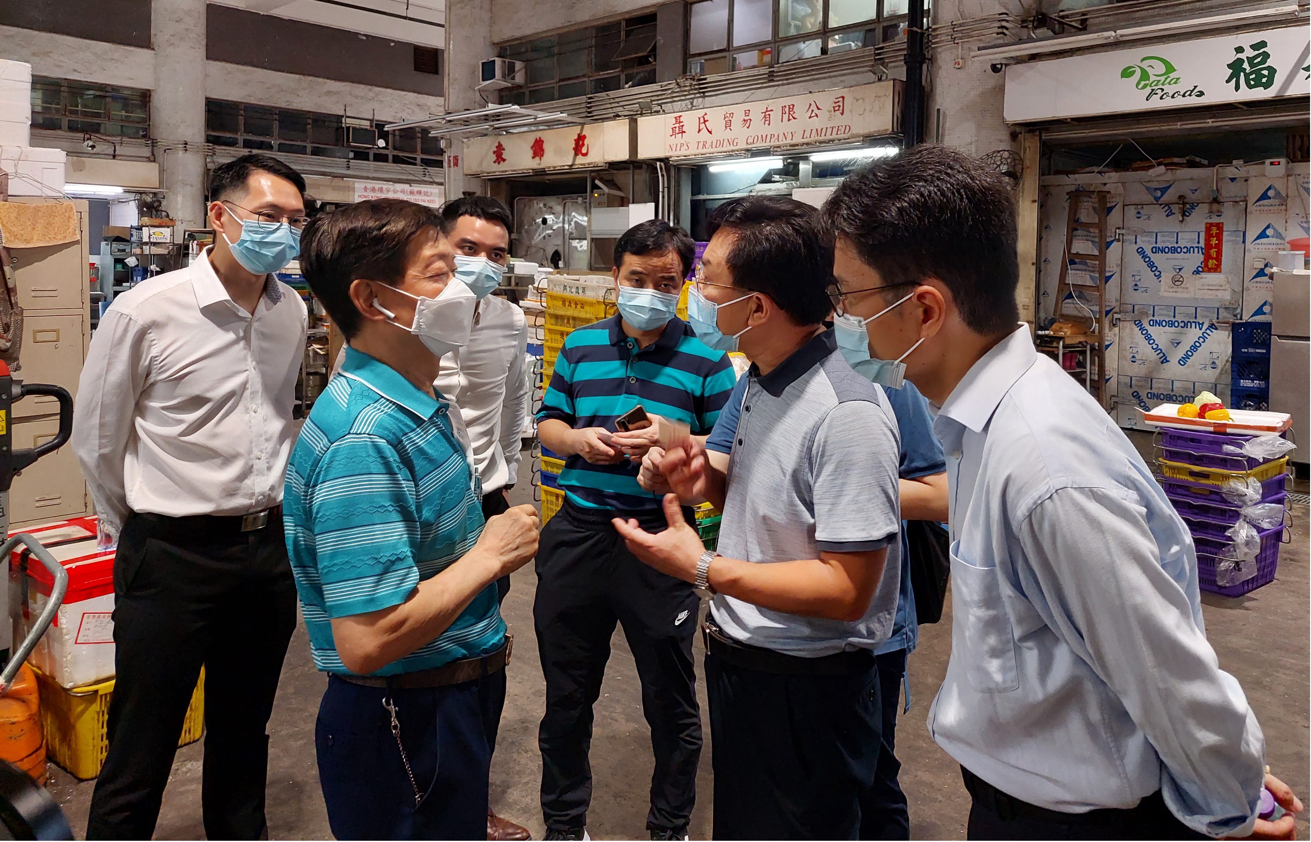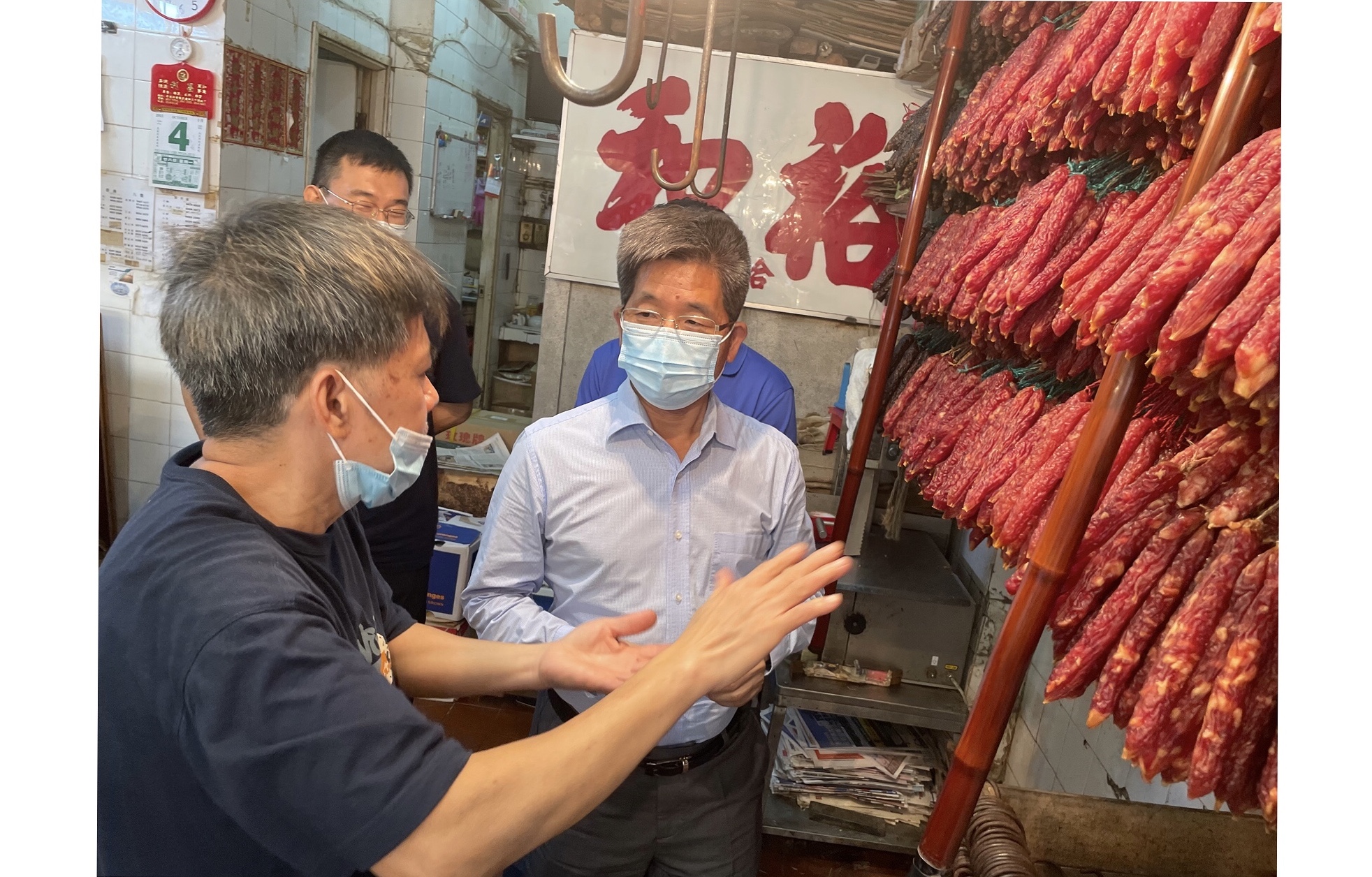 国庆期间,香港中联办秘书长王松苗与行财部陈志斌等12名同事一道,分三组先后到西环副食品批发市场、深水埗北河街街市、跑马地黄泥涌街市、香港仔鸭脷洲街市、德辅道、海味街等地落区聆听。三个落区调研组重点走访了西环昌盛号、稳记鲜果、联发土产等10余个商铺,问问“菜篮子”,聊聊“果盘子”,了解货品价格、进货渠道、销售情况以及疫情影响。特区政府有关部门人员参加了个别走访。