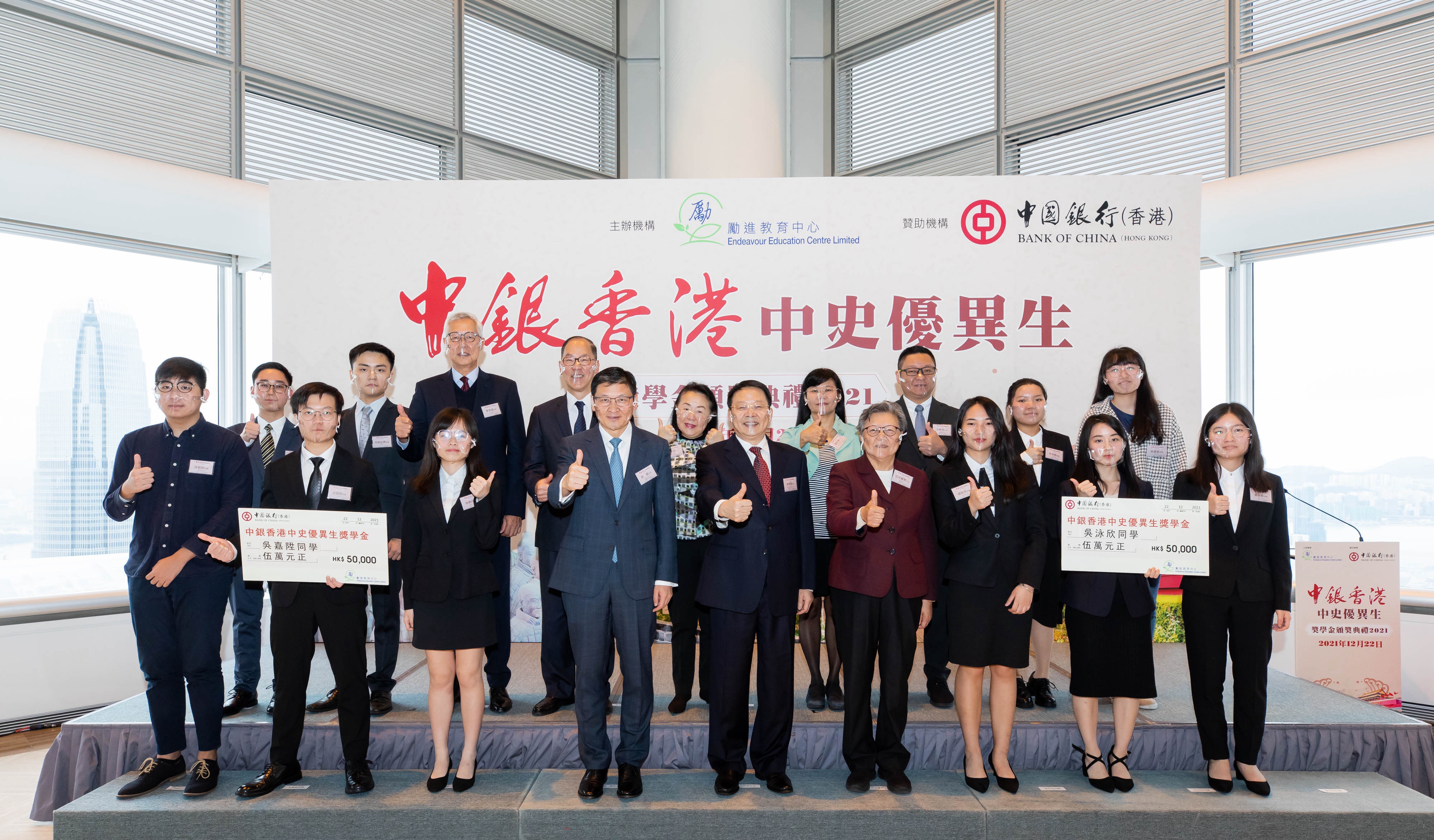 本网讯 12月22日,中银香港中史优异生奖学金颁奖典礼在中银大厦举行。香港中联办副主任尹宗华、中银香港总裁孙煜、励进教育中心理事会主席范徐丽泰等共同主礼并向获奖学生颁奖。