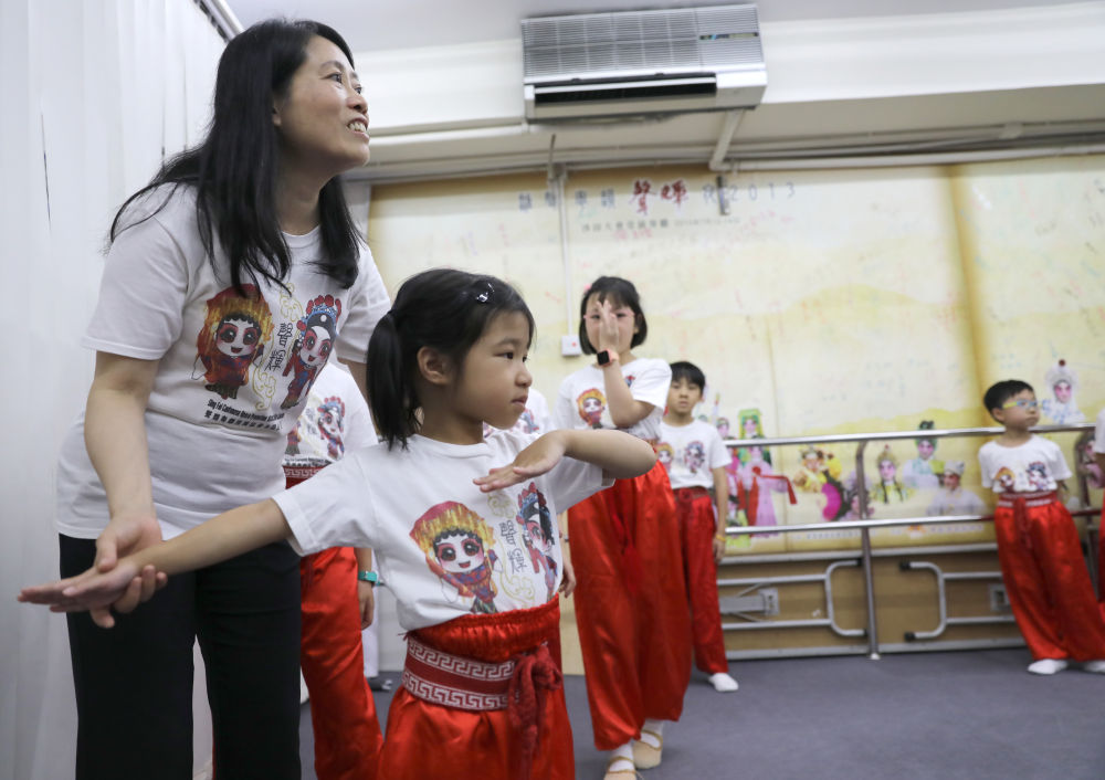 粤剧主要流行于广东、广西和香港、澳门等地区。图为香港声辉粤剧推广协会会长芳雪莹(左)在指导孩子们练功(资料照片)。(新华社记者 吴晓初 摄)