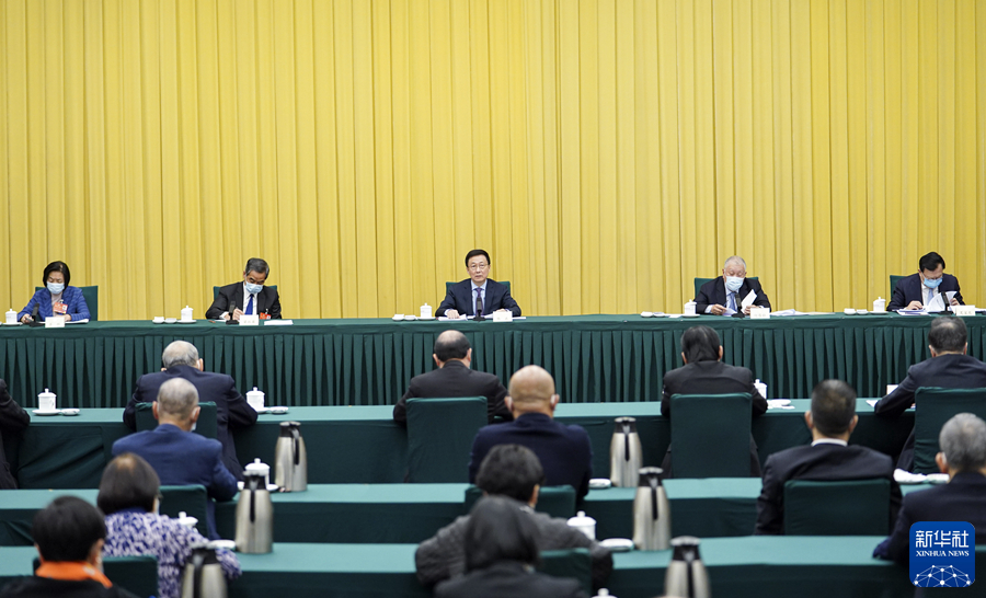 3月6日,中共中央政治局常委、国务院副总理韩正看望出席全国政协十三届五次会议的港澳地区全国政协委员并参加讨论。(新华社记者 殷博古 摄)