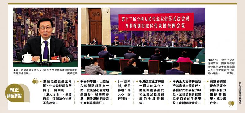 中共中央政治局常委、国务院副总理韩正3月7日上午参加十三届全国人大五次会议香港代表团审议并发表重要讲话。香港全国人大代表团新闻发言人陈勇在会后对媒体表示,韩正副总理在讲话中重申,无论是过去还是今后,中央始终都会坚持“一国两制”、“港人治港”、高度自治,这个决心始终不会改变。中央制定出台的举措,都是为了香港长期繁荣稳定和长治久安,维护香港同胞长远切身利益。