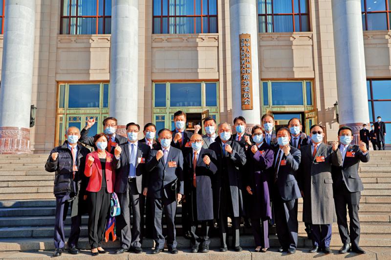 图:全国人大香港代表团表示,香港要主动对接国家发展战略,融入国家发展大局。图为港区人大代表在北京合照。(图片来源:中通社)
