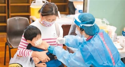香港特区政府葵青民政事务处、葵青地区抗疫连线、青衣区小学校长会、荃湾及葵青幼稚园校长会近日在长亨社区会堂合办葵青区儿童科兴疫苗接种活动。图为工作人员为儿童提供疫苗接种。(中新社记者 陈永诺 摄)