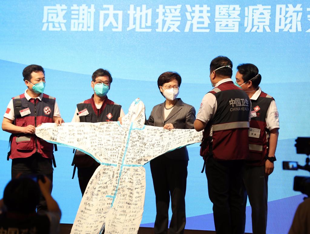 5月5日,内地援港医疗队向香港特区行政长官林郑月娥(左三)赠送签名防护衣。(新华社记者 李钢 摄)