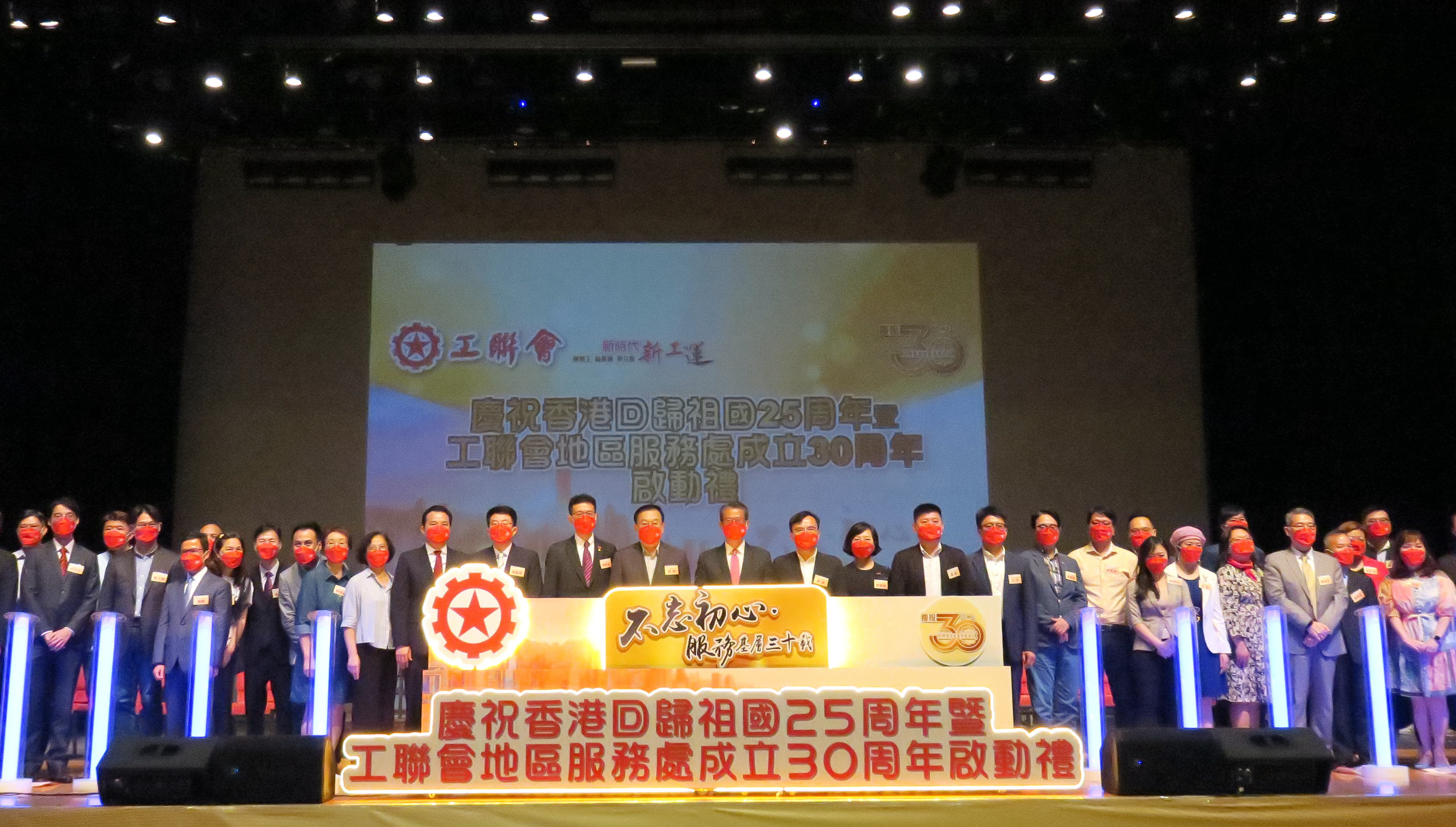 本网讯 7月10日,香港工联会举办庆祝香港回归祖国25周年暨工联会地区服务处成立30周年启动礼。我办副主任何靖应邀出席,并与香港特区政府财政司司长陈茂波、民政及青年事务局局长麦美娟等共同主礼。香港十八区民政事务专员、工联会各工会理干事和地区骨干义工,友好团体代表等900余人出席活动。