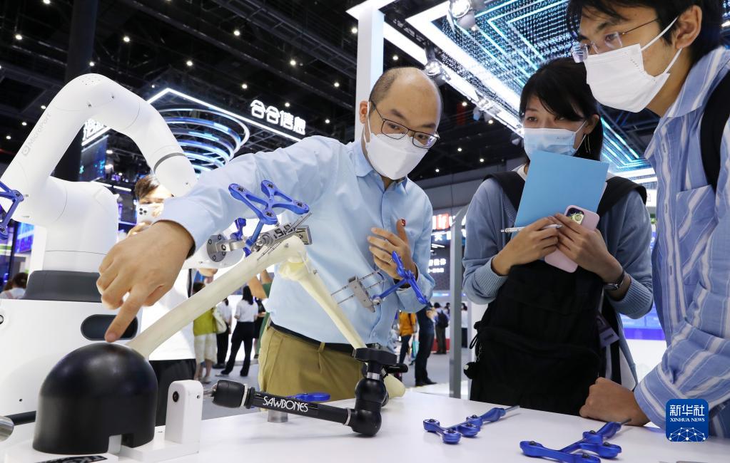 2022年9月1日,工作人员(左一)向参观者介绍微创骨科手术机器人。当日,2022世界人工智能大会在上海世博中心拉开帷幕。(新华社记者 方喆 摄)