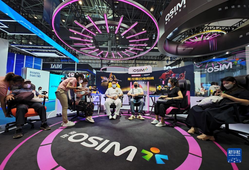 观众在第二届中国国际消费品博览会上体验按摩电竞椅(2022年7月28日摄)。(新华社记者 郭程 摄)