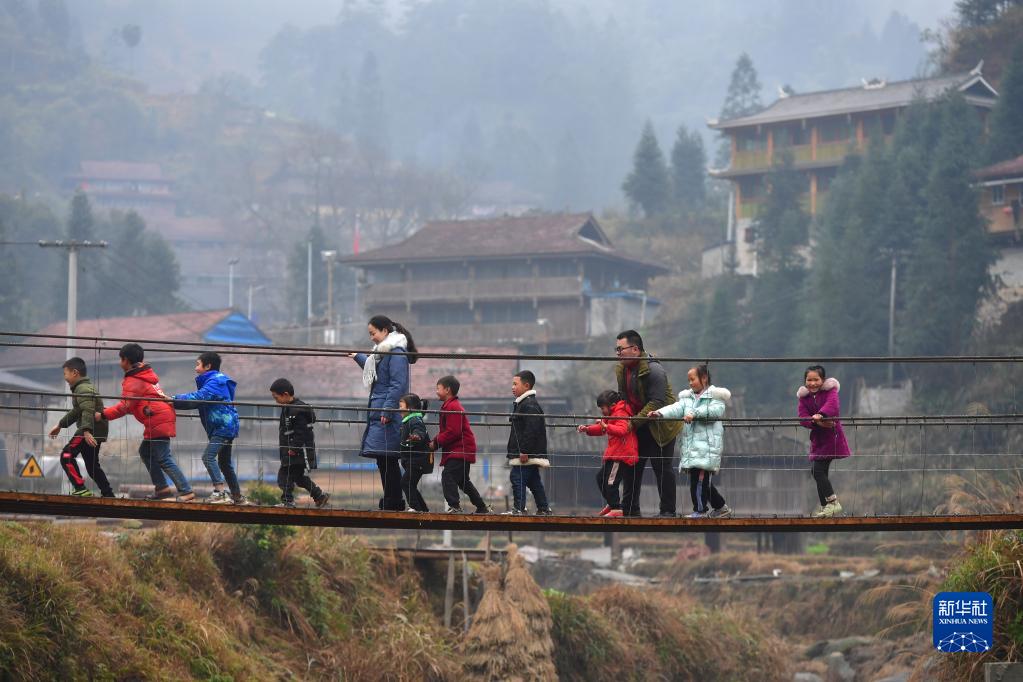 在位于广西融水苗族自治县和贵州省从江县交界的乌英苗寨,郑昌昊(右三)和妻子吴晗(左五)带着孩子们玩耍(2021年1月30日摄)。郑昌昊是广西柳州市委宣传部干部,曾于2020年4月至2021年5月在乌英苗寨担任驻村工作队队员,吴晗曾多次到乌英苗寨教学点支教。(新华社记者 黄孝邦 摄)