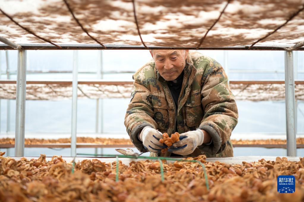 在黑龙江省绥化市明水县兴仁镇石人村的食用菌种植基地,建档立卡户林德山在晾滑子蘑,他在这里打工年收入在1万元以上(2020年10月11日摄)。(新华社记者 王建威 摄)