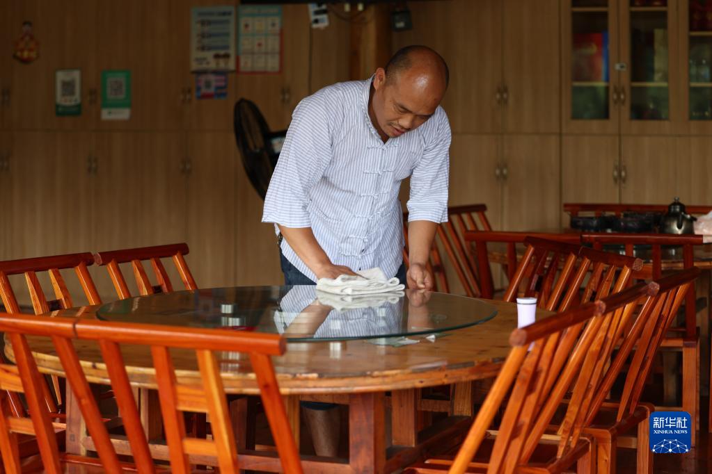 在湖南省湘西土家族苗族自治州十八洞村,杨正邦在自家农家乐打扫卫生(2022年7月2日摄)。(新华社记者 薛宇舸 摄)