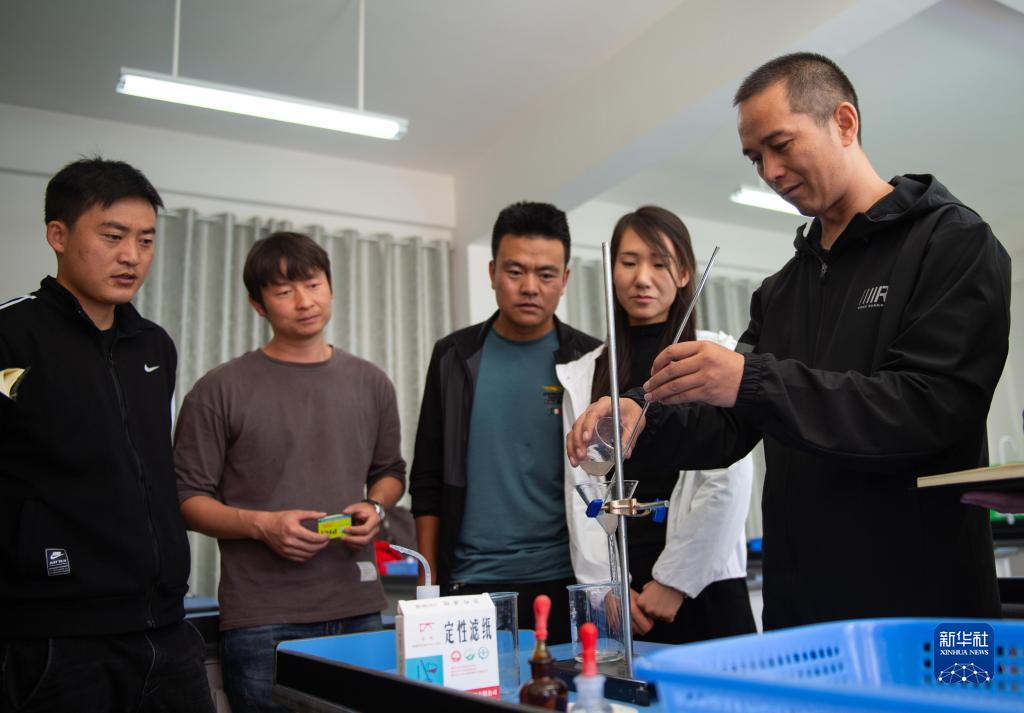 北京市援青支教教师、来自通州区陆辛庄学校的化学教师祁生贵(右一)在青海省玉树州第四民族高级中学指导学校教师进行实验教学(2020年8月12日摄)。(新华社记者 陈钟昊 摄)
