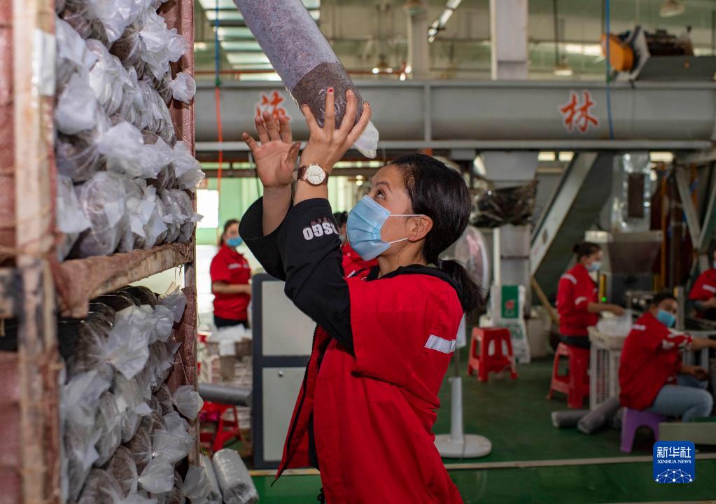 新疆墨玉县萨依巴格乡村民阿孜古丽?阿卜力提甫在当地一家菌业公司的菌种装袋车间工作(2020年9月22日摄)。(新华社记者 胡虎虎 摄)
