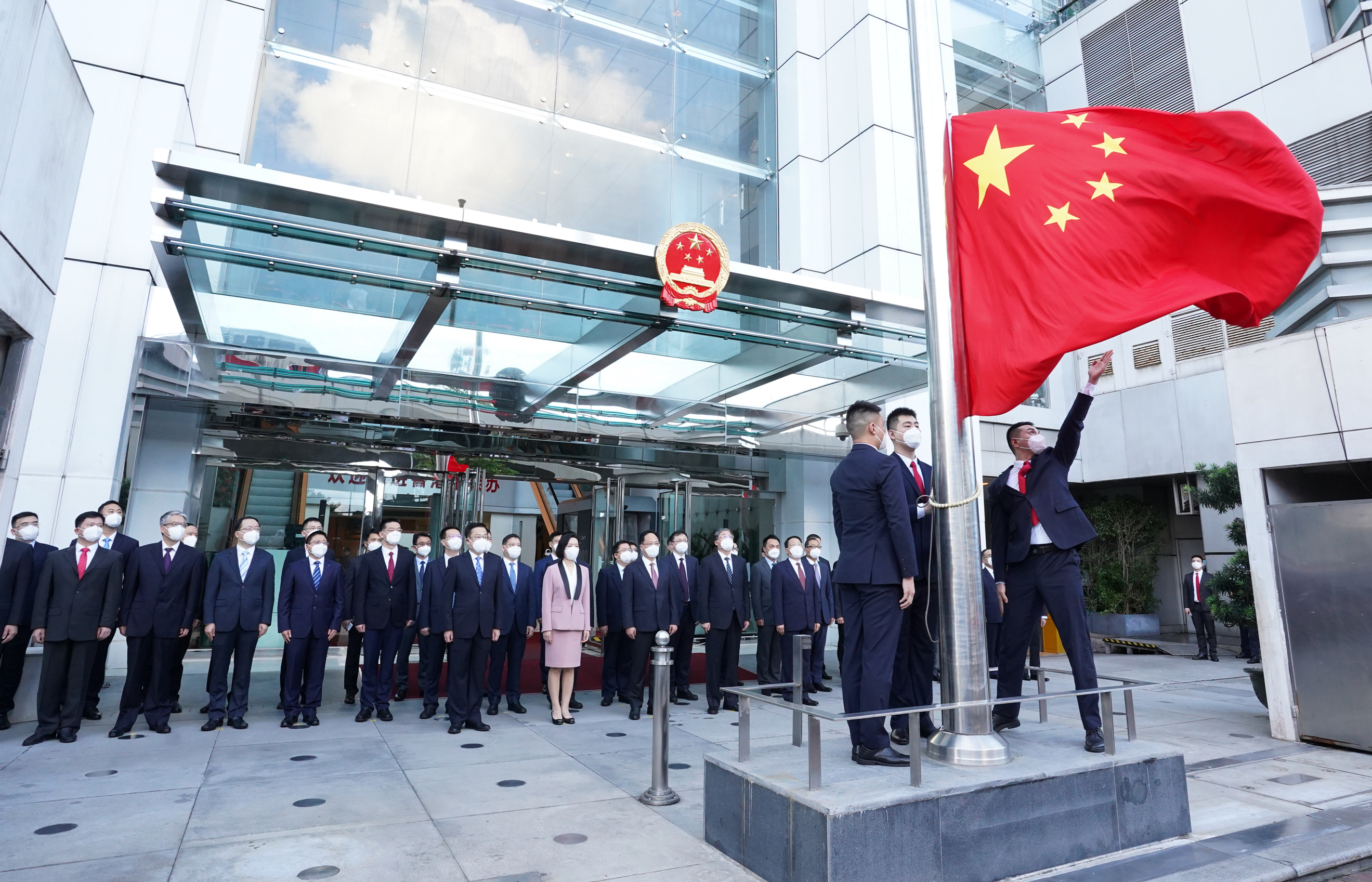 7时整,升国旗仪式开始。香港中联办副主任陈冬、卢新宁、罗永纲、何靖、尹宗华,以及干部员工代表在办公楼前庄严肃立。升旗手护送国旗进场,步伐铿锵。伴随着雄壮的国歌声,鲜艳的五星红旗冉冉升起。全体人员行注目礼向国旗致敬,齐声高唱国歌,祝福伟大祖国繁荣富强、国泰民安。