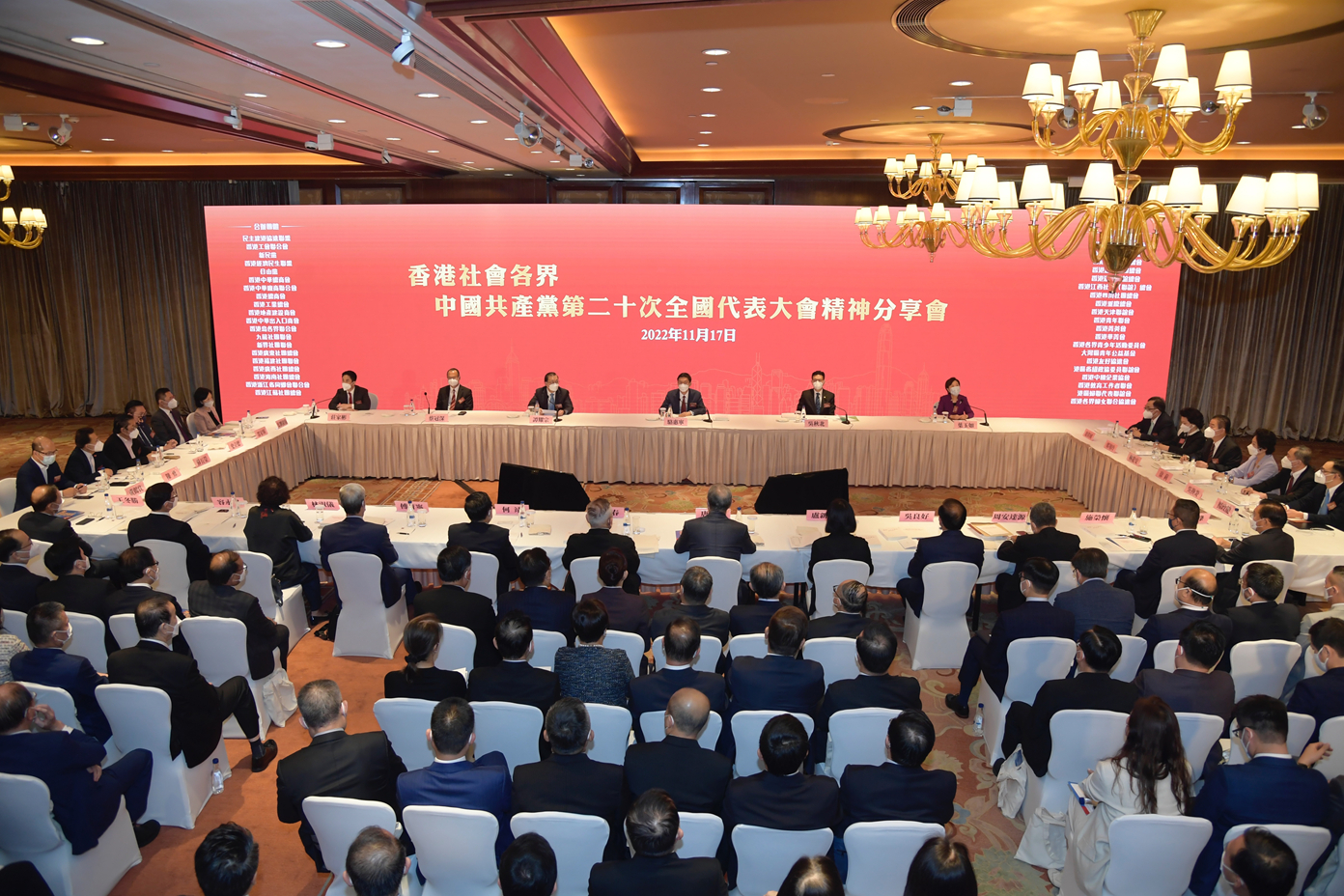 本网讯 11月17日,香港40家政团社团联合主办“中国共产党第二十次全国代表大会精神分享会”,香港中联办主任骆惠宁应邀出席并作交流分享。他全面介绍了二十大主要精神和重大意义,分享了新时代十年伟大变革的重大意义和新征程的使命任务,阐述了国家发展与香港机遇的深刻关联,以及创造新伟业所需的团结奋斗精神。希望大家共同支持行政长官和特区政府依法施政,团结一切建设香港的积极力量,为中华民族伟大复兴和香港长期繁荣稳定作出更大贡献。全国人大常委会委员谭耀宗主持分享会。